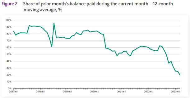 We focus on three signals that contributed significantly to changes in Jenny Craig’s PD prior to its bankruptcy: the 12-month moving average share of tradeline balances from the past month that are paid off, the 12-month moving average share of tradeline balances that are more than 90 days past due date, and total spending. These signals indicate Jenny Craig was facing significant stress in mid-2020. The firm’s payment rate sharply dropped shortly after the onset of the pandemic and then steadily declined in the second half of 2022 (Figure 2). Such behavior is an indication of a cash liquidity crunch as decreased earnings forced managers to direct funds to higher priority obligations such as payroll at the expense of other owed accounts.